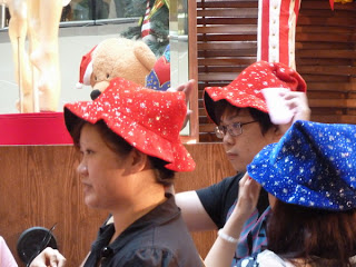 Visiting Father Christmas in Mid Valley was a bit like a production line. Families bought tickets, their money actually going as a donation to a childrens' home in Taman Seputeh. Then they lined up, were all given a colourful hat, then spent a very short time with Santa and his santarinas.