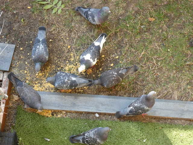 By Sept the wood pigeons had disappeared, leaving just the feral pigeons. They wait in the morning for their food, and then in the afternoon they start to gather, hoping to be fed again.