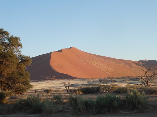 Sossusvlei is a salt and clay pan surrounded by high red dunes in the southern part of the Namib Desert. Sossus is no return or dead end, vlei is marsh, now clay pan. We then made our way back, it was a bit of a slog, and nice when we could walk on the harder dry salt and clay.